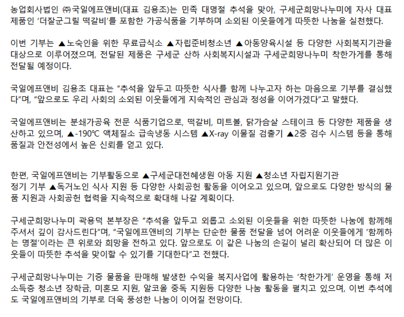 국일에프앤비, 추석 앞두고 소외 이웃에게 식품 기부로 온정 전해-20251001